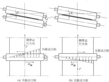 若輥?zhàn)邮菐?qū)動(dòng)的,給不銹鋼帶的作用力是向前的動(dòng)力,則不銹鋼帶所受到的向前的動(dòng)力的合力偏向不銹鋼帶被夾緊的一端,會(huì)產(chǎn)生一個(gè)使不銹鋼帶向這一方向偏移的力偶M偏,所以不銹鋼帶是向著壓力大、輥?zhàn)娱_(kāi)口小的一端偏移。若輥?zhàn)邮菑膭?dòng)的,給不銹鋼帶的作用力是向后的阻力,則會(huì)使不銹鋼帶向壓力小、輥?zhàn)娱_(kāi)口大的一端偏移。